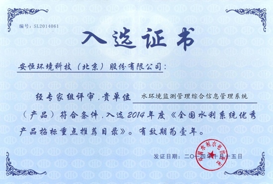 安恒集团LIMS水环境监测管理综合信息管理系统入选《2014年度全国水利系统*秀产品招标重点推荐目录》