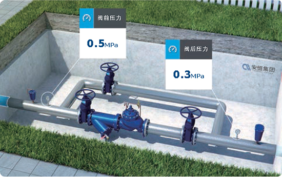 通过在供水管线上(通常与DMA 分区结合)加装水力减压阀及智能压力控制系统,依据所控制区域的流量、压力监测数据分析变化曲线及规律,以此为基础按实际需求对阀后压力进行动态调节,从而实现对控制区压力的精细化管理,有效降低冗余水头并带来相应的综合效益。