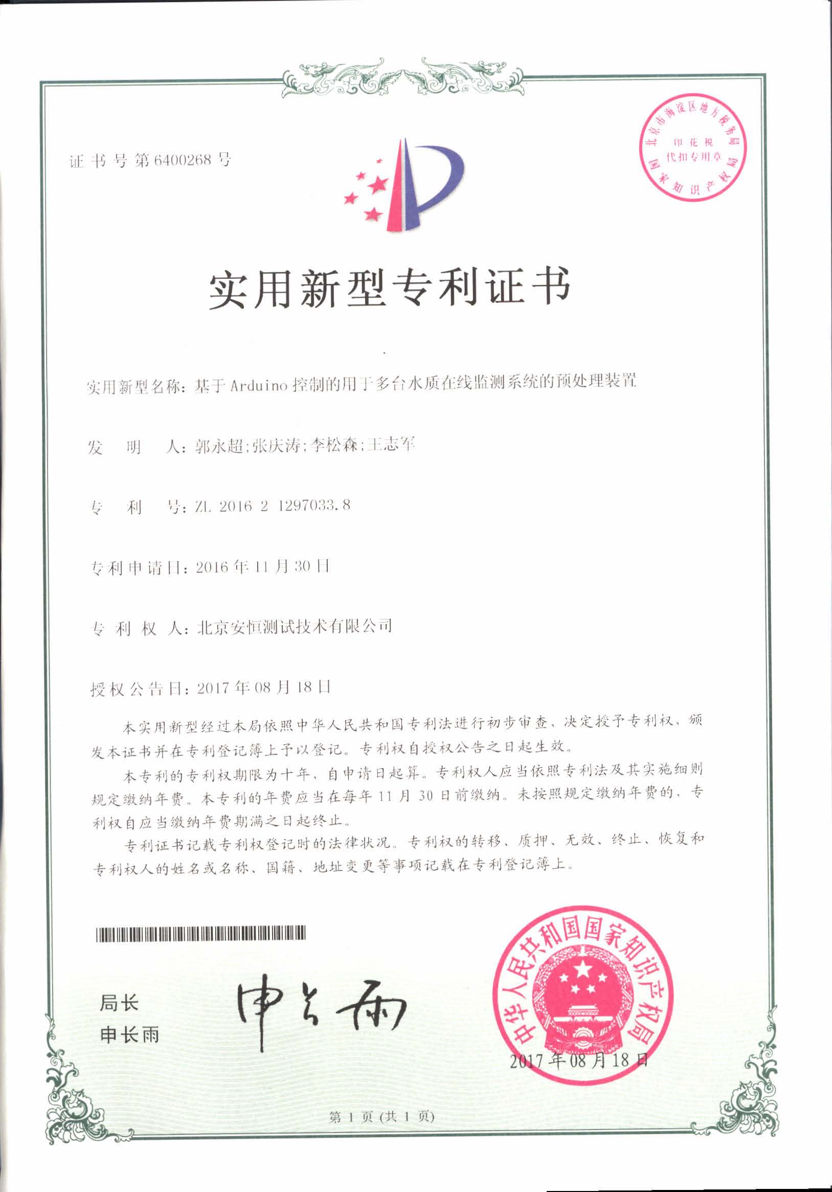 实用新型——基于Arduino控制的用于多台水质在线监测系统的预处理装置